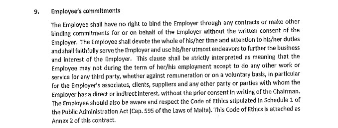 The contract states explicitly that “the employee may not during the term of his employment accept to do any other work or service for any third party, whether against remuneration or voluntarily, in particular for the employer’s associates, clients, suppliers and any other part or parties with whom the employer has a direct or indirect interest, without the prior consent of the chairman” – Marshall himself.