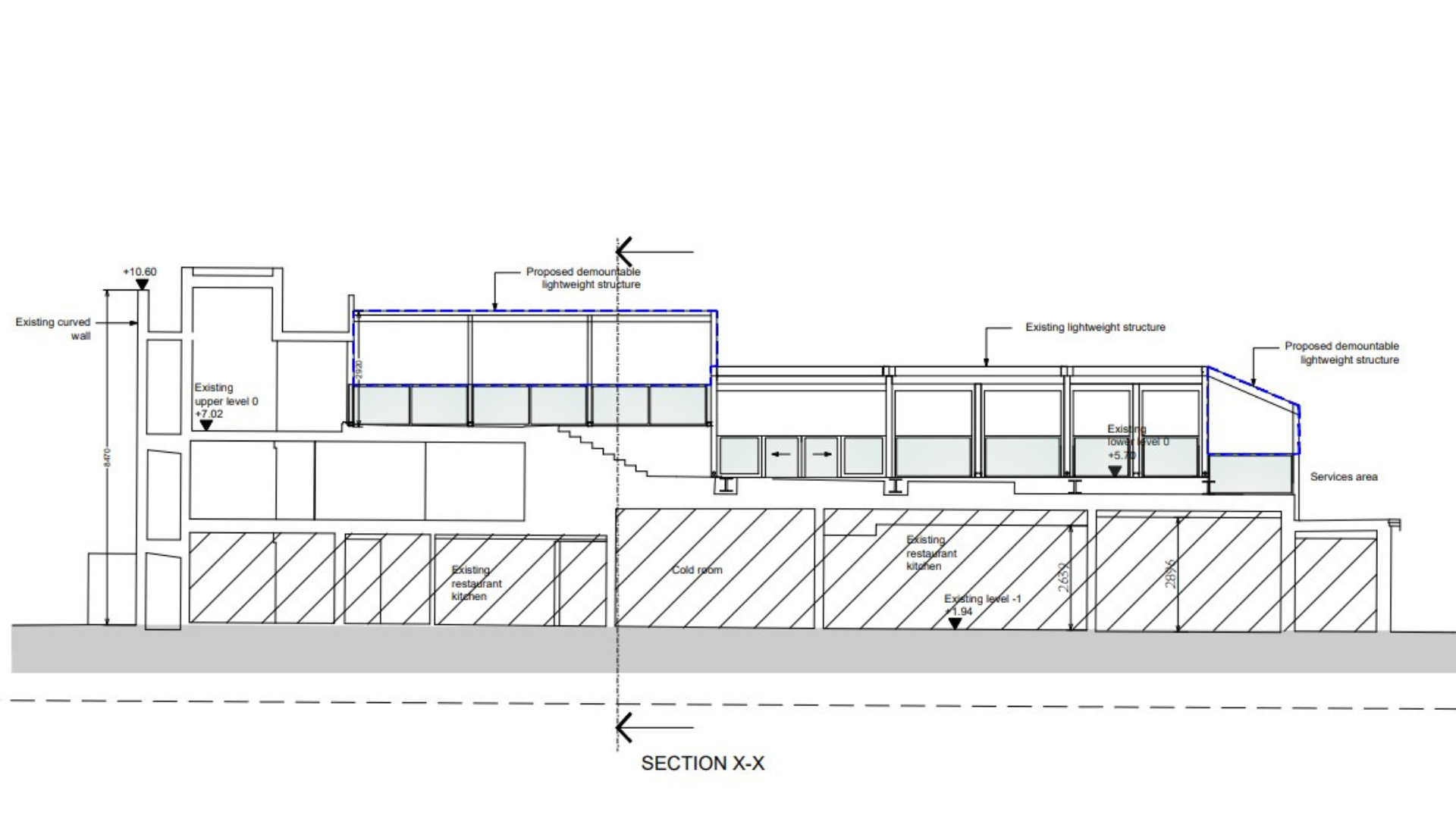 While described as “lightweight” and “demountable”, the structure roofs over the existing restaurant, creating an enclosed area for further seating and essentially constructing an entire additional storey.