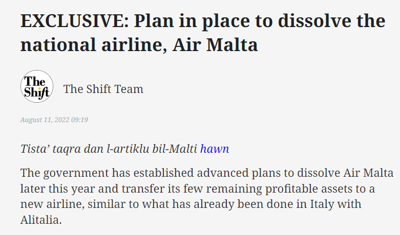 In April, The Shift also revealed that Air Malta’s closure would happen after the summer season, and a new airline created. Air Malta Chairman David Curmi later confirmed this.