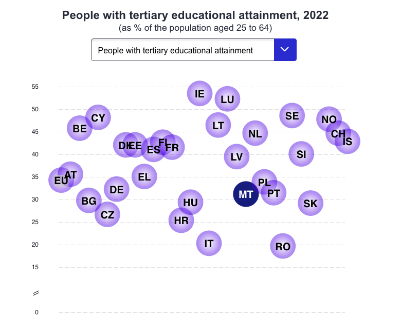 According to the latest Eurostat data, in 2022, the percentage of the population with tertiary-level education in Malta stood at 31.2%, a drop from 31.7% in the previous year and still below the overall EU average of 34.3%.