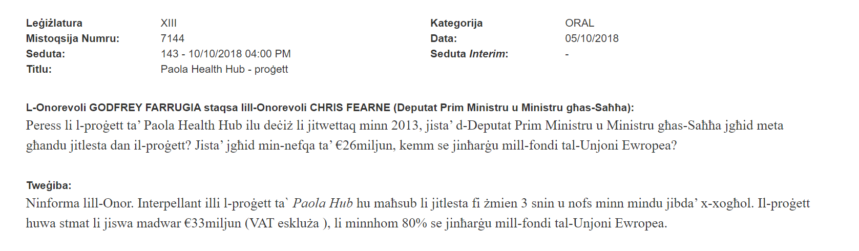 In 2018, Fearne had told Farrugia, through another parliamentary question, that the project was expected to cost €33 million, 80% of which came from European Union funds.