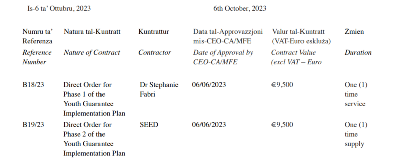 A job writing a report for the EU-funded Youth Guarantee Implementation Plan, necessary as part of Malta’s obligations to Brussels, was divided in two, with half awarded to Stephanie Fabri and the other half to a company co-owned by her husband, Jean-Paul Fabri.