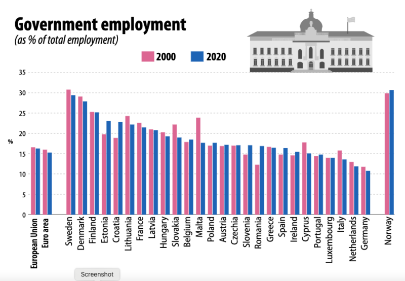 Eurostat data for 2020 also describes how Malta experienced the most significant decline in the share of government employees in the workforce in Europe over the last two decades.