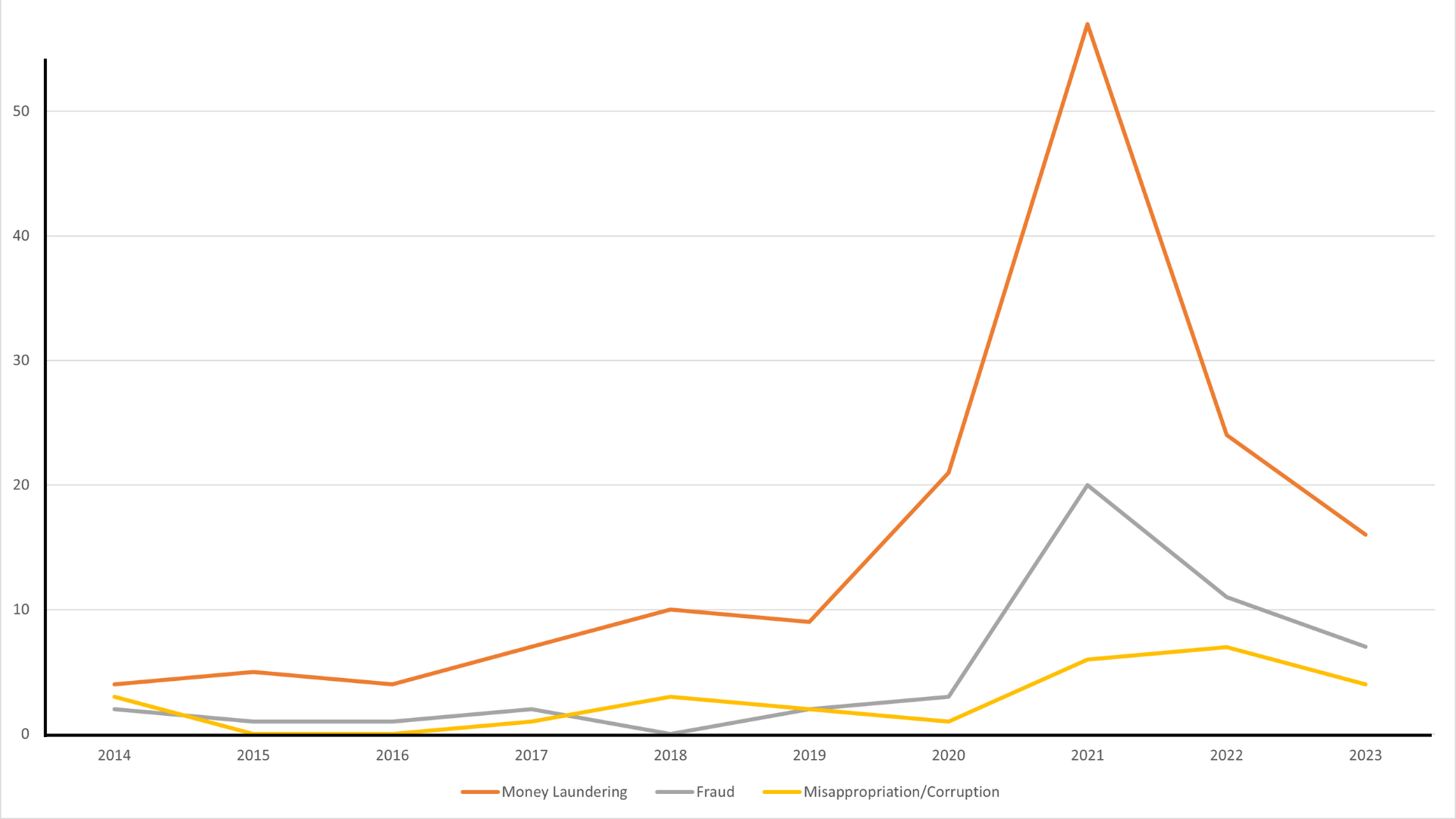 Organised by year and the suspected crime in each case, the data shows a noticeable spike in money laundering, fraud, corruption and tax evasion charges leading up to 2021.