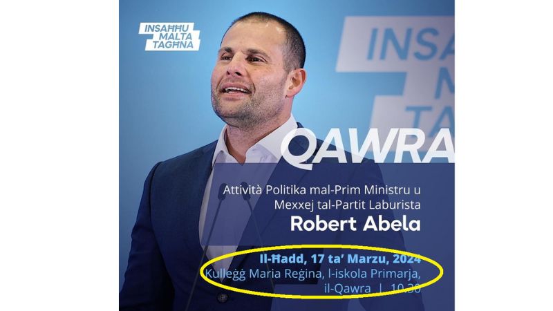 This Sunday, the hall of Maria Regina College in Qawra will also host a Labour Party event for Prime Minister Robert Abela.