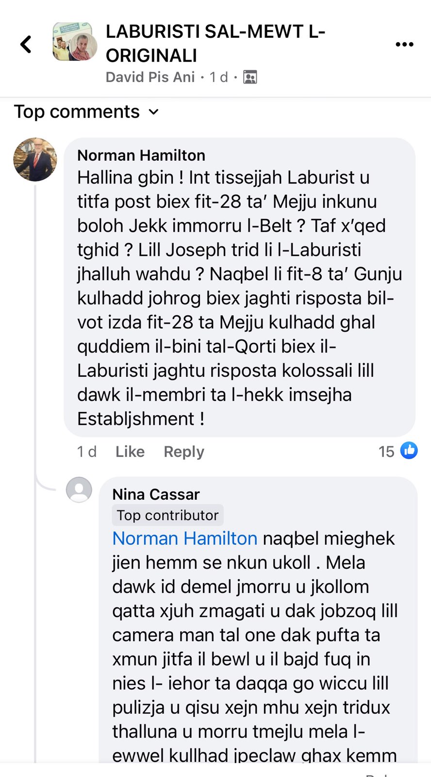 It seems the dullard also has a problem with rudimentary Maltese, referring to the other guy as his forehead (gbin), as opposed to ‘xbin’, for mate, buddy, etc.