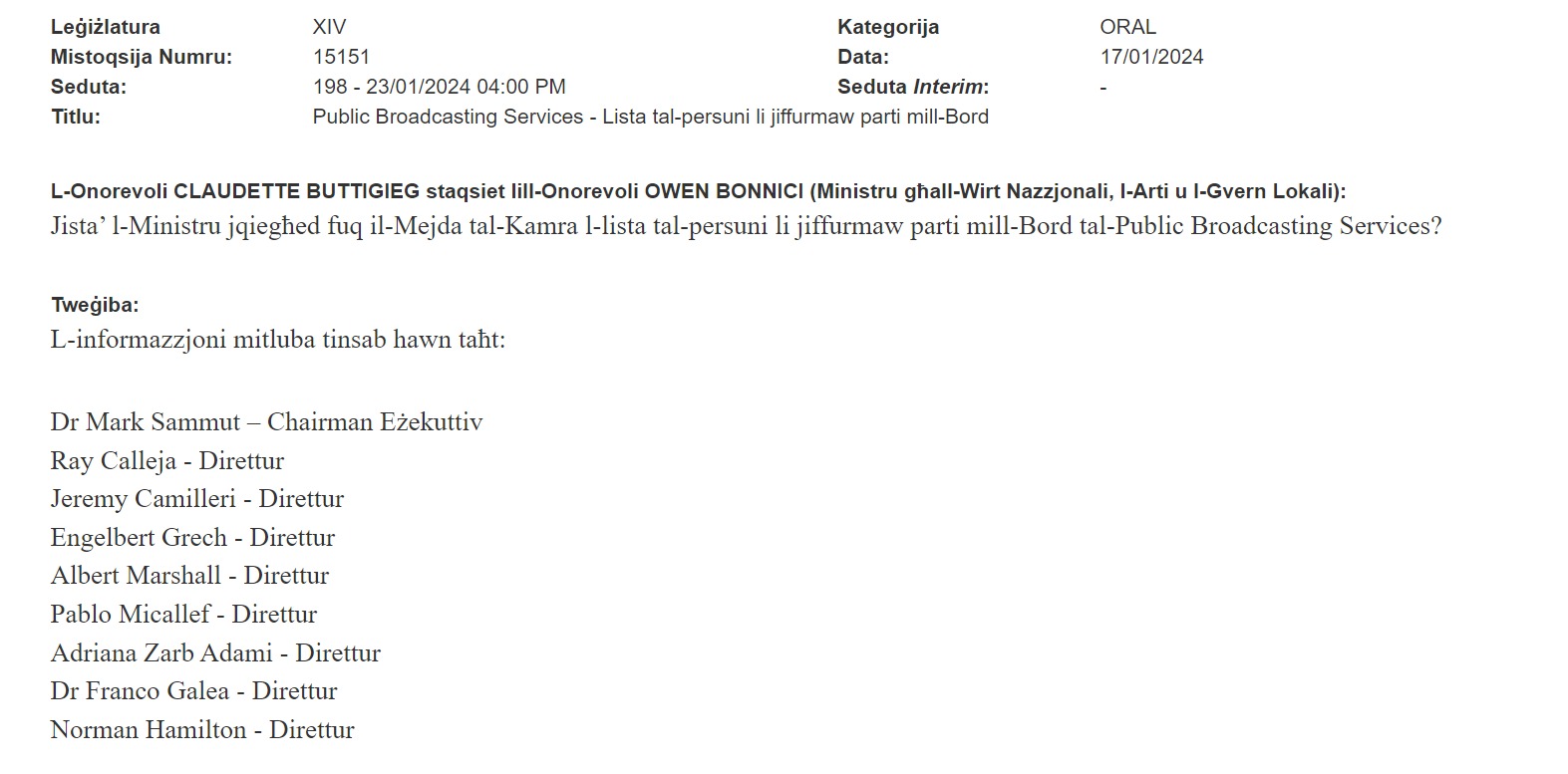 Heritage Minister Owen Bonnici confirmed Norman Hamilton formed part of the PBS board in answer to a parliamentary question by Opposition MP Claudette Buttigieg.