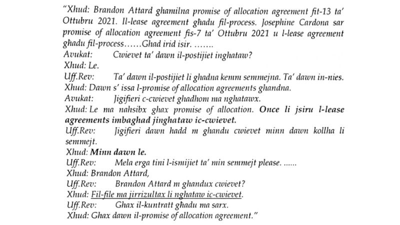 Falzon insisted her only role in the debacle was to meet with individuals who had been promised housing units in Binja Silvio Parnis in Siggiewi. Her responsibility was to prepare the final lease deed and the transfer of utility meters for the unoccupied apartments.