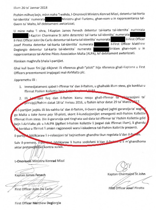 Il-ftehim sekondarju li kien ġie ffirmat mal-piloti fl-2018 kien raġuni ewlenija għal dan kollu. Dak il-ftehim kien jagħti “garanziji ta’ impjieg” lill-piloti mill-gvern bl-istess kundizzjonijiet li jkollhom f’dak il-mument.