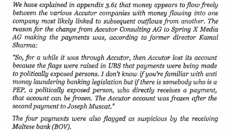 The VGH inquiry established that Accutor AG’s monthly payments of €15,000 to disgraced former prime minister Joseph Muscat were stopped not only because Accutor went out of business but also because Swiss bank UBS froze the company’s account and all subsequent payments on suspicion of kickbacks.