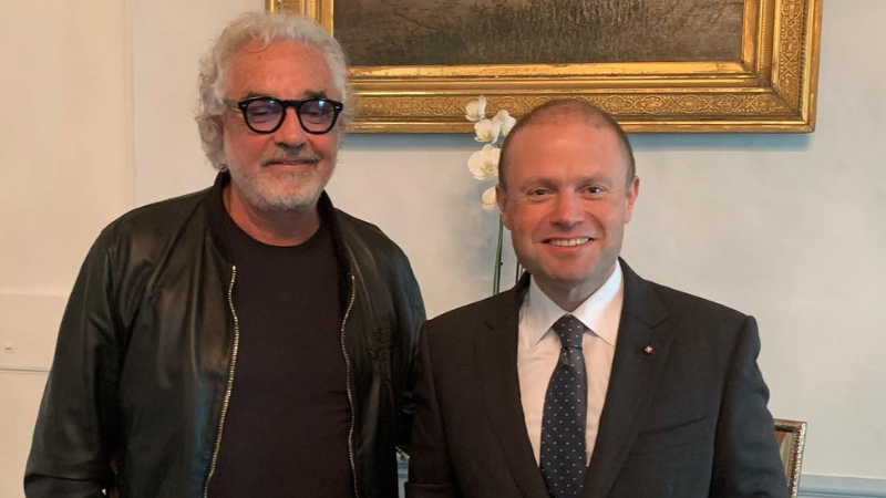 It isn’t known when they first met, but a photo posted on Briatore’s Facebook page on 15 November 2018 with the comment “primo minister!! Grazie per l’accoglienza” shows them together at what appears to be Castille, the prime minister’s office in Malta.