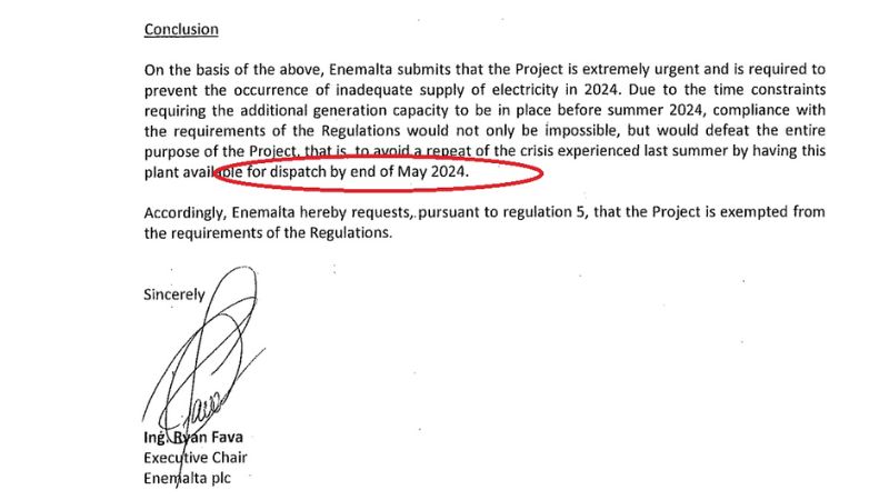 In a letter sent to the Environment and Resources Authority (ERA) earlier this year, attempting to justify a fast-tracked permit for the temporary power plant, Fava wrote that the new 60MW temporary plant would provide energy from Delimara by the end of May 2024.