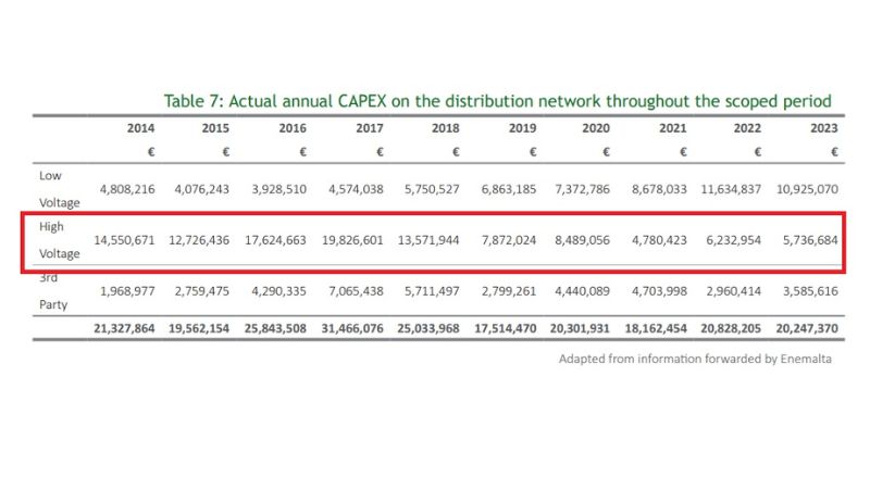 Despite the obviously predictable massive rise in energy demand, Dalli oversaw the most radical spending cuts on the distribution system. While €14.5 million was spent upgrading the grid in 2014 under Konrad Mizzi, Dalli spent just €4.78 million in 2021.