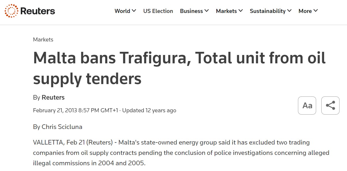 In 2013, Trafigura and Totsa, at the time represented by rogue oil dealer George Farrugia and his company Powerplan, were at the centre of a political storm in the dying days of the PN administration as a scandalous commissions racket involving the highest echelons of Enemalta was revealed.