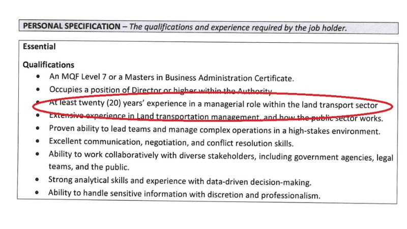 The vacancy notice specified that the right candidate required 20 years of experience in a managerial role in land transport and held the position of director or higher. Only Agius met these requirements.