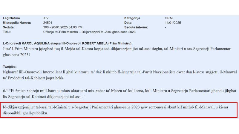 Earlier this week, following up on this newsroom’s report, PN MP Karol Aquilina asked Robert Abela to state why he has not published the annual asset declarations for 2023.