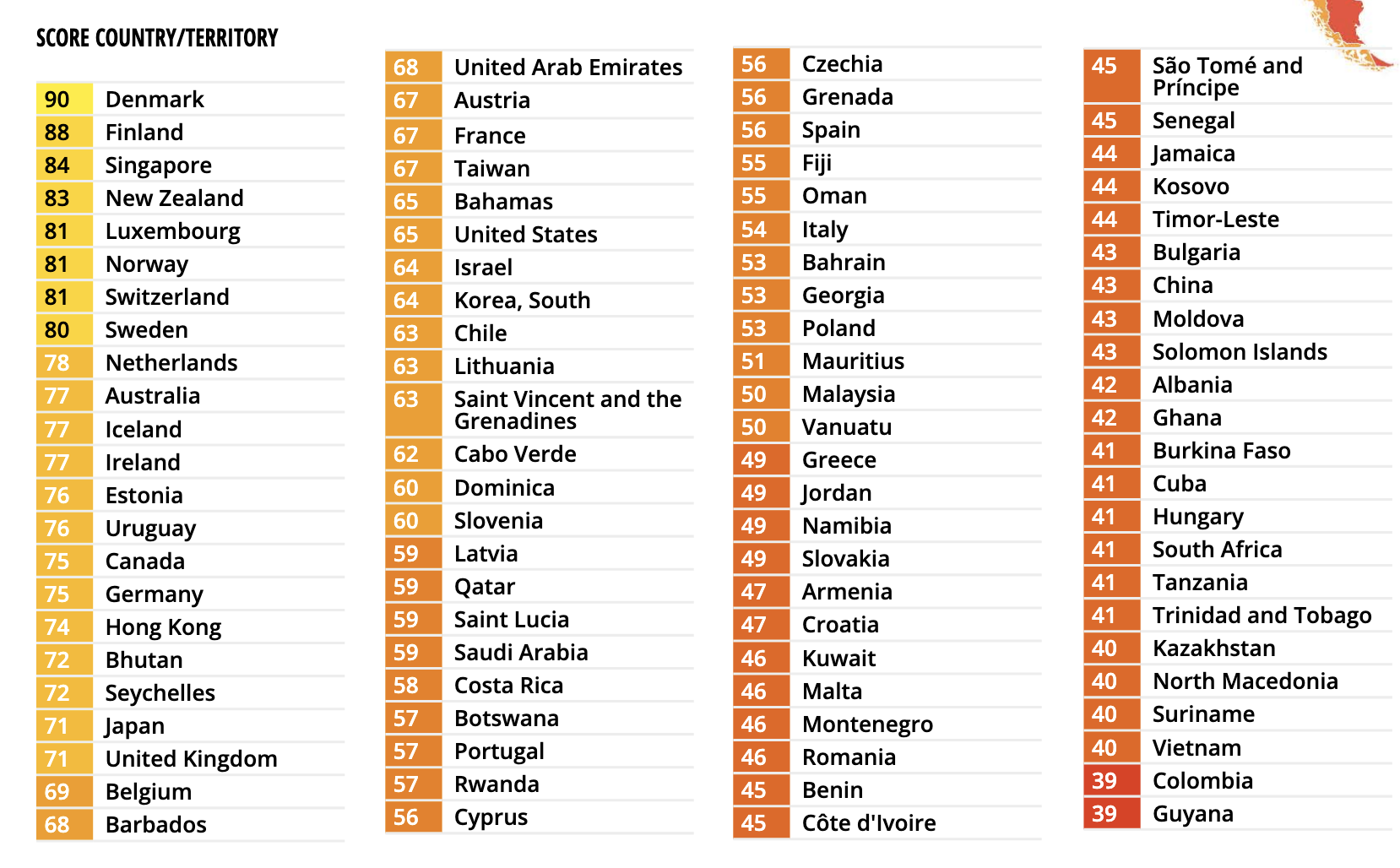 The CPI is the leading global indicator of public sector corruption, providing an annual comparative snapshot of 180 countries and territories. The Index for 2024 is calculated using data from 13 external sources.
