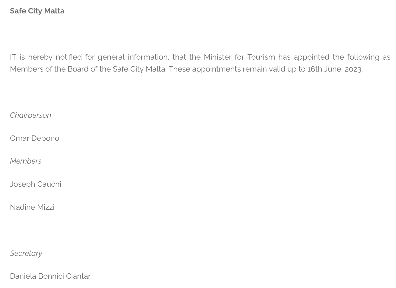 Despite these concerns, Safe City Malta was allocated an annual budget of €400,000. Despite clear indications that the project would be shut down, the tourism ministry appointed board members to serve until June 2023.